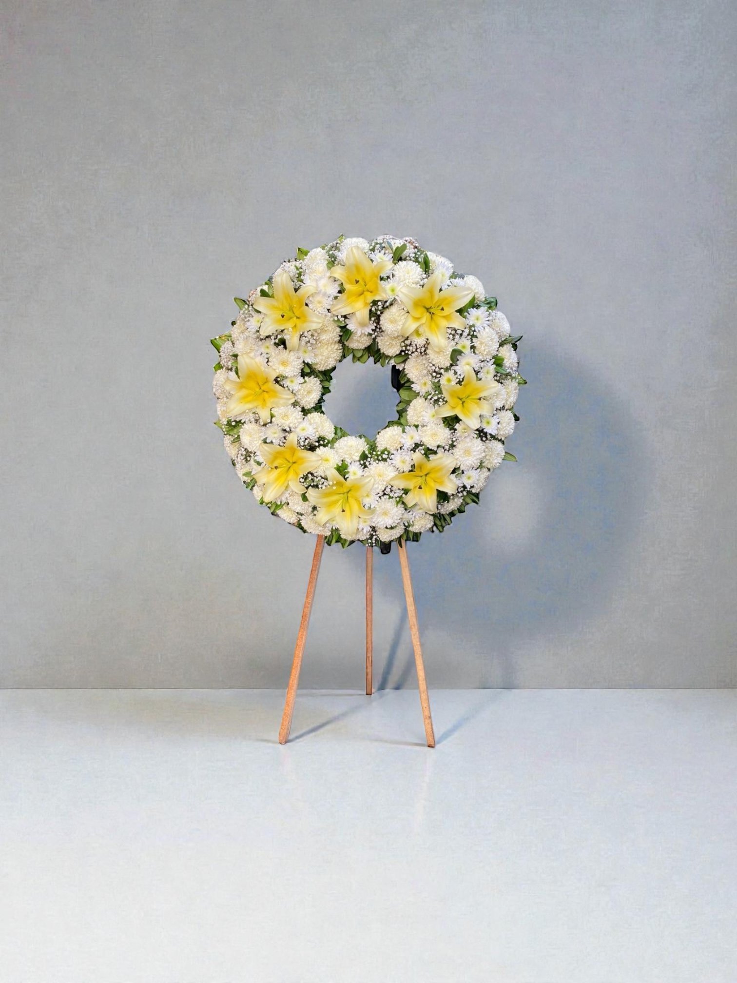 Nuestra Corona Fúnebre Blanca con Lirios Amarillos está elaborada con flores naturales frescas, cuidadosamente seleccionadas para transmitir respeto, serenidad y acompañar momentos de despedida. Es ideal para funerales, velatorios y servicios conmemorativos, con entrega el mismo día en CDMX y municipios del Estado de México, sujeta a zona y horario.