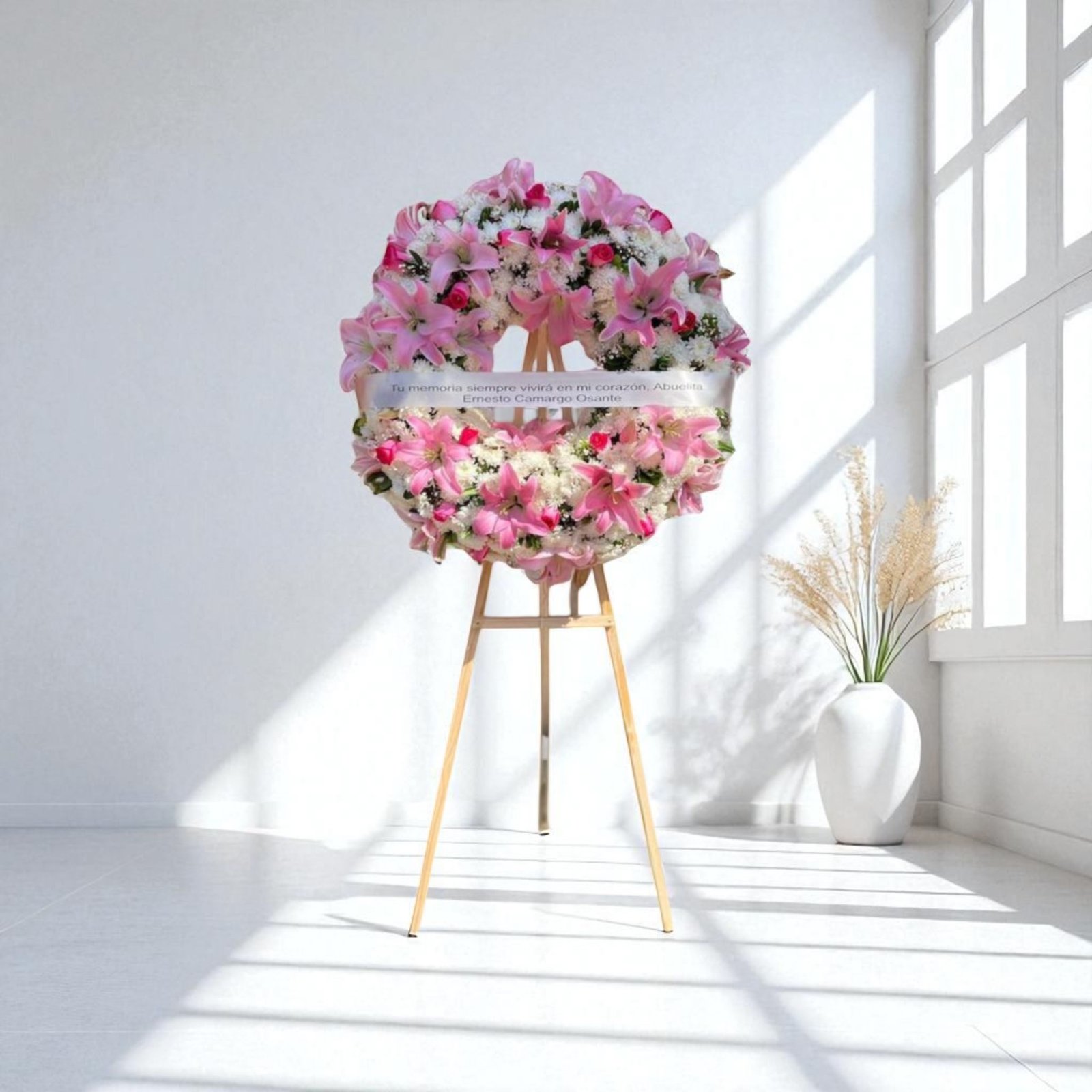 La Corona Fúnebre Condolencias Mujer está diseñada para transmitir amor, paz y un homenaje lleno de sensibilidad. Su combinación de lirios rosas, flores blancas y follaje verde crea un arreglo armónico que simboliza ternura, gratitud y despedida respetuosa.
