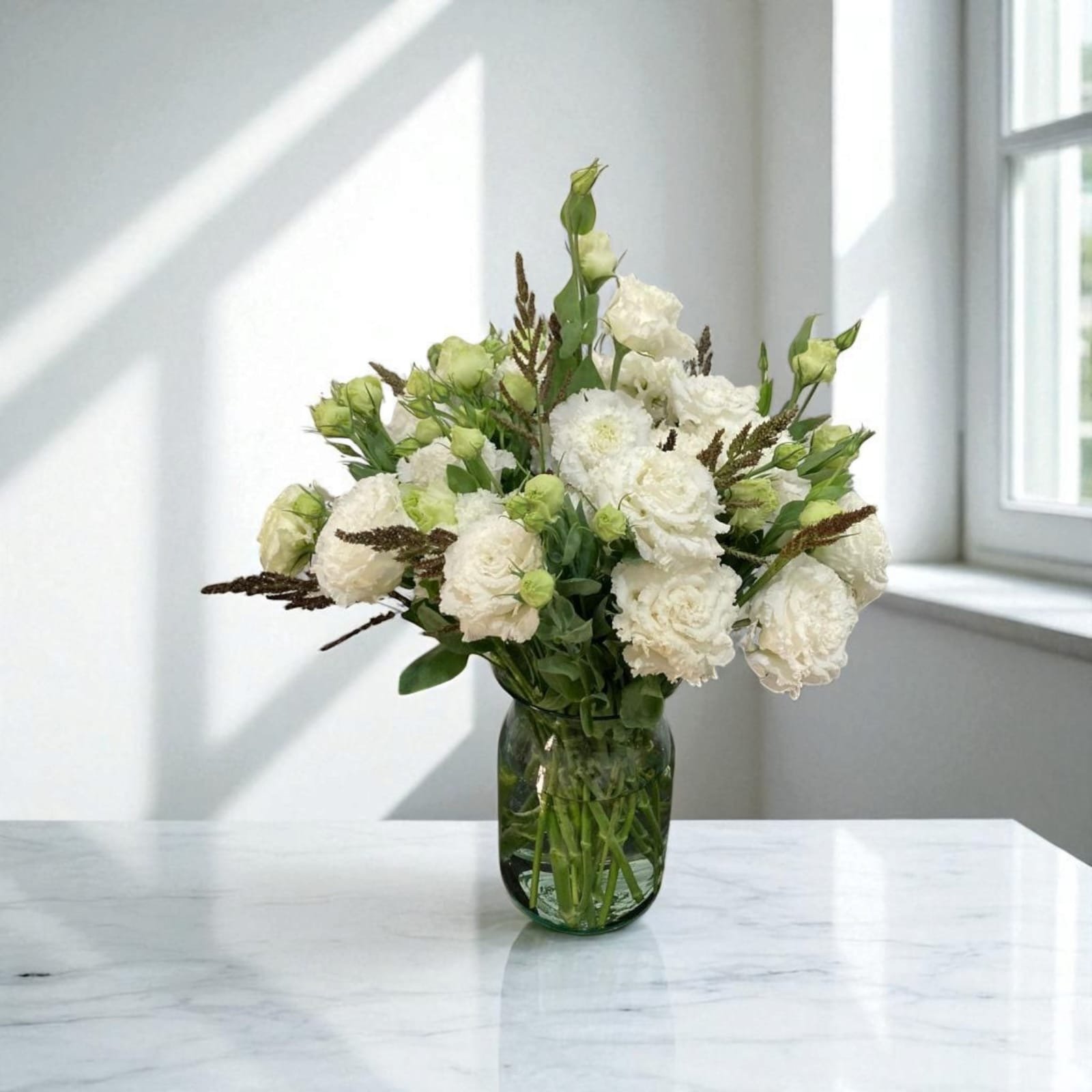 El Florero de Condolencias es un detalle lleno de paz, respeto y sensibilidad para acompañar a una familia en un momento de despedida. Sus flores blancas premium —lisianthus, y acentos verdes— transmiten pureza, luz y tranquilidad, convirtiéndose en un mensaje sincero de apoyo y cariño.