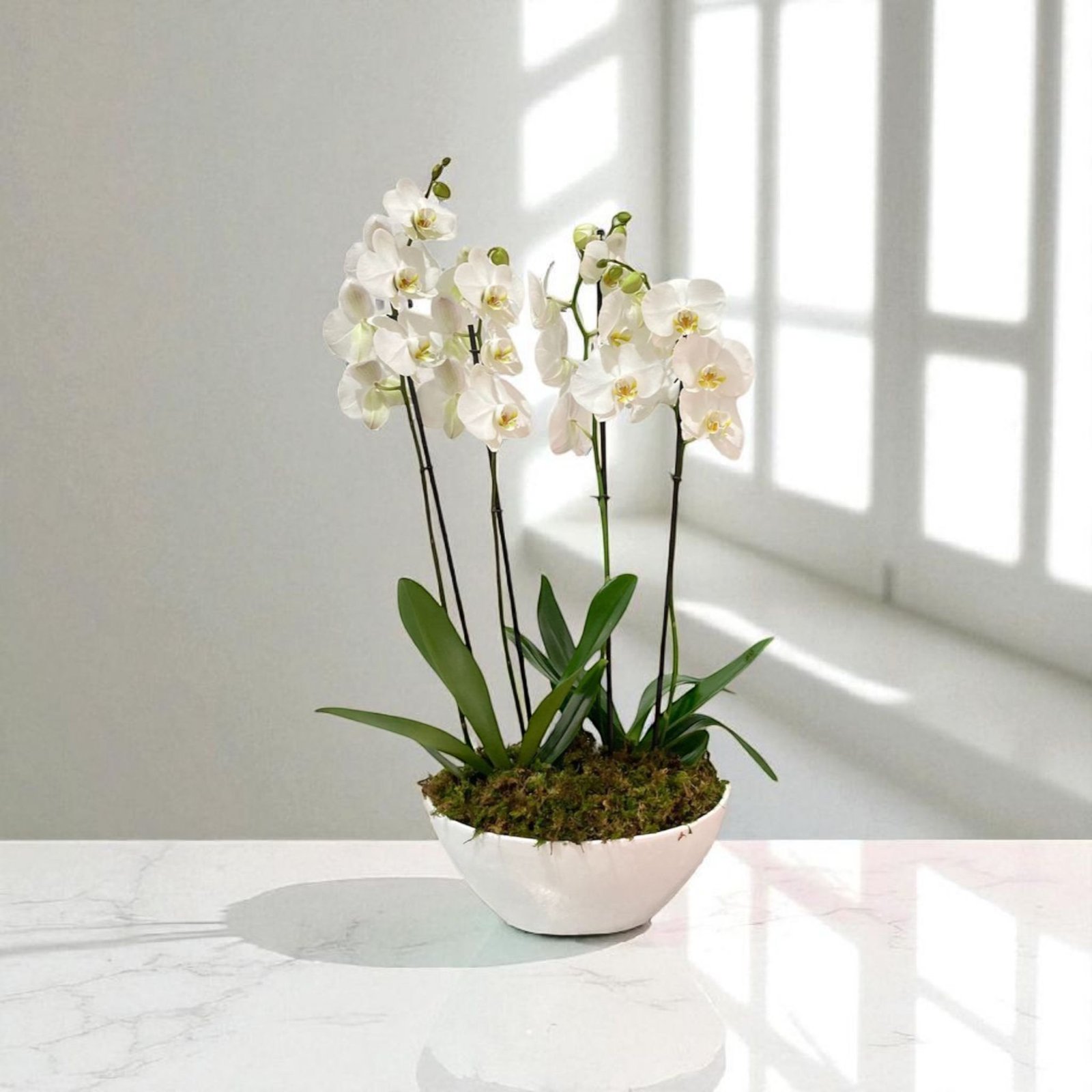 Esta pieza está elaborada con orquídeas Phalaenopsis blancas de alta calidad, montadas en una base de cerámica premium y cubiertas con musgo natural, creando un acabado moderno, sobrio y totalmente armonioso.
